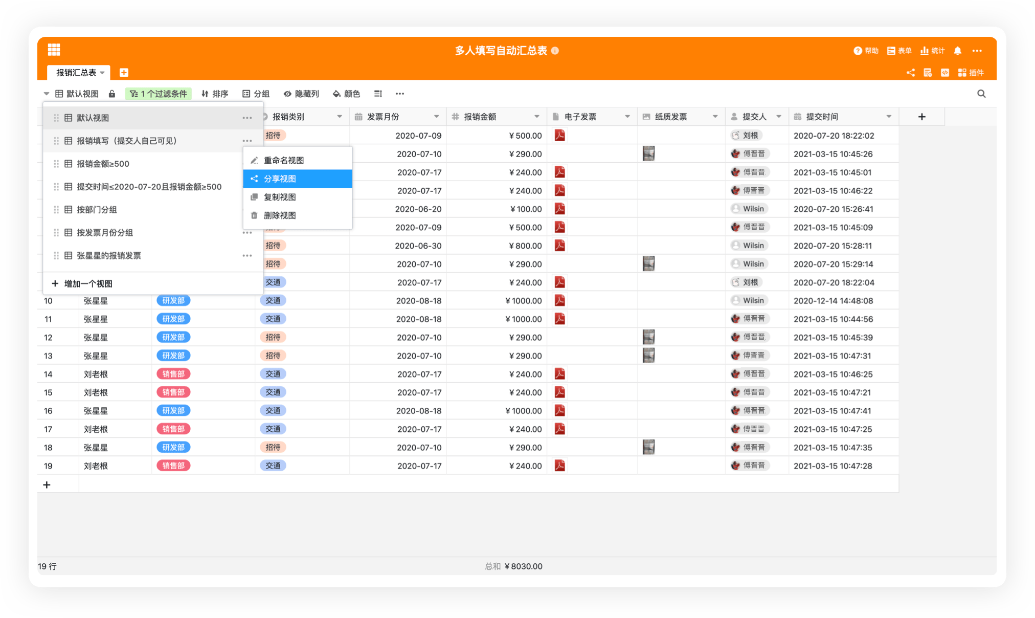 点击分享视图并选择共享给团队内部的哪些人、部门、群组。(所有人填写的数据会实时自动汇总到表格的默认视图里,也会实时进入到符合视图条件的各个视图里,也会进入到创建好的统计图表里)