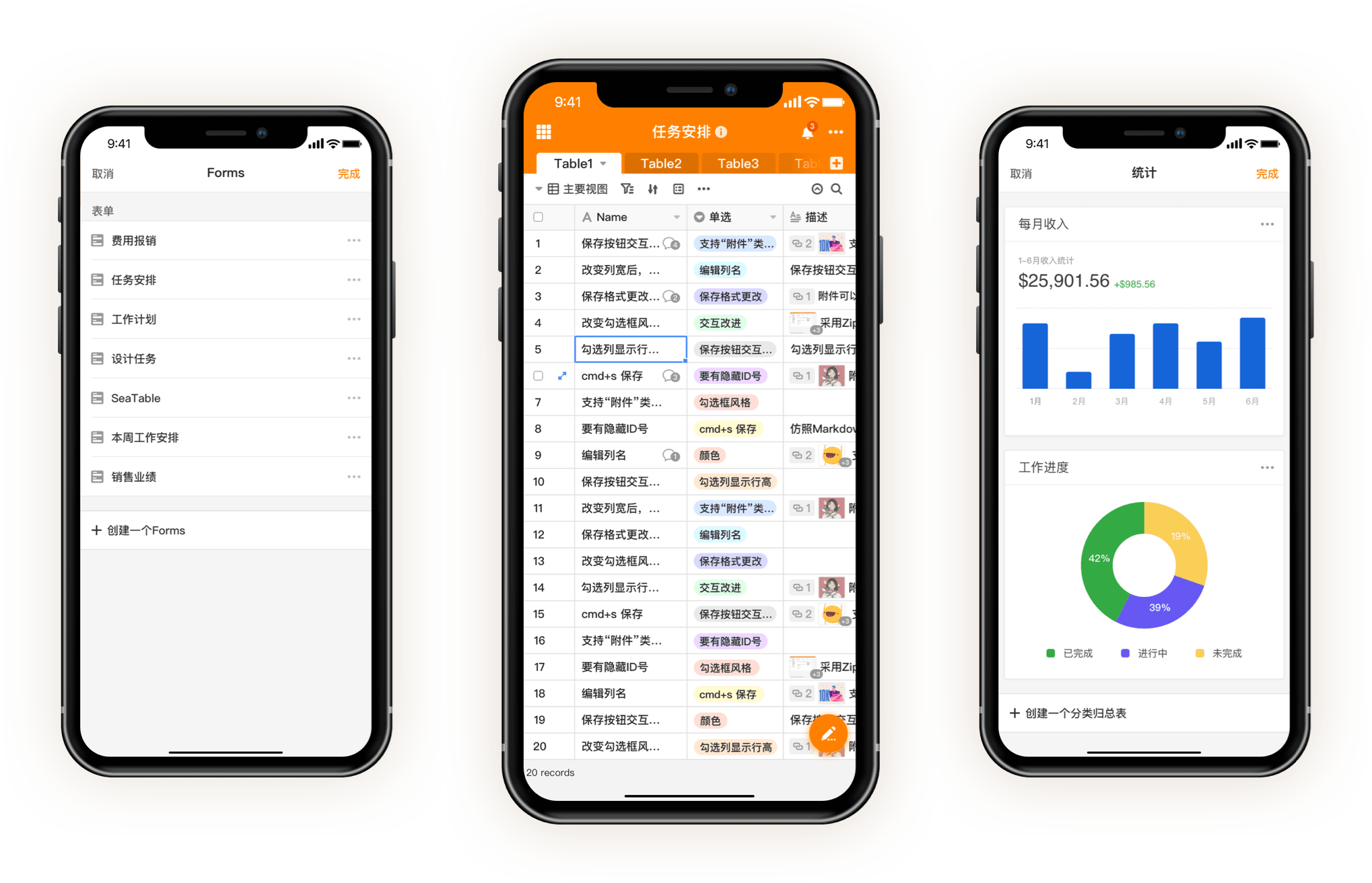 SeaTable 是一款以智能表格为基础的新型数字化平台。它支持“文件”、“图片”、“单选项”、“协作人”、“计算公式”等丰富的数据类型,帮助用户用表格的形式来组织和管理各类信息。在表格基础上,它还支持自定义工作流、应用搭建、数据分析等丰富的扩展功能,让团队和企业快速搭建出灵活的业务系统和软件应用,低门槛实现工作的数字化。