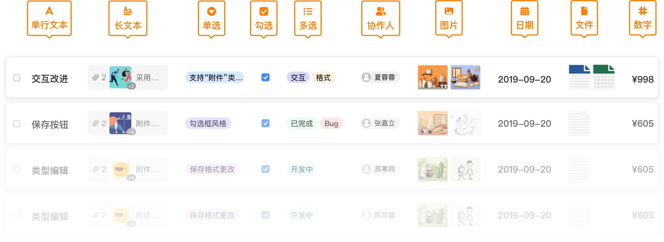 除了支持文本、数字、日期这样的基本类型,还支持单选、多选、勾选、长文本、图片、文件、协作人、创建者、创建时间、链接其他记录、公式等数据类型。