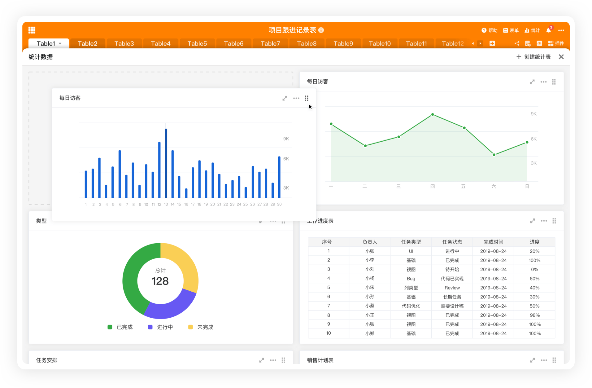 高级统计内置 BI 能力,图表类型丰富,可结合视图对复杂数据、大数据快速完成统计分析。图表可导出。大屏仪表盘可增加多个。