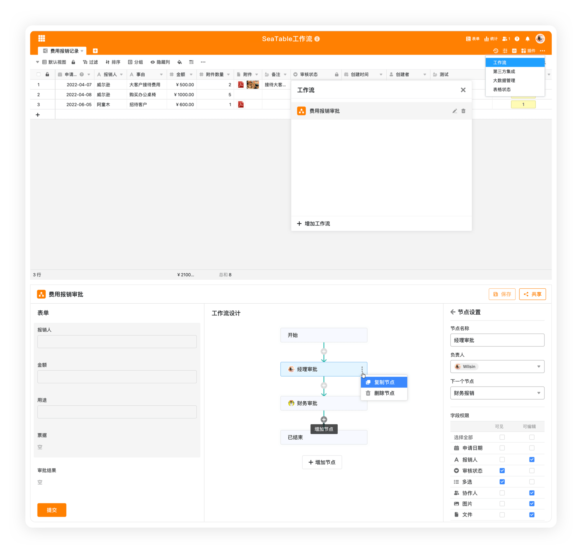内置工作流功能,在表格基础上完成数据改动审批、表单流转等需求
