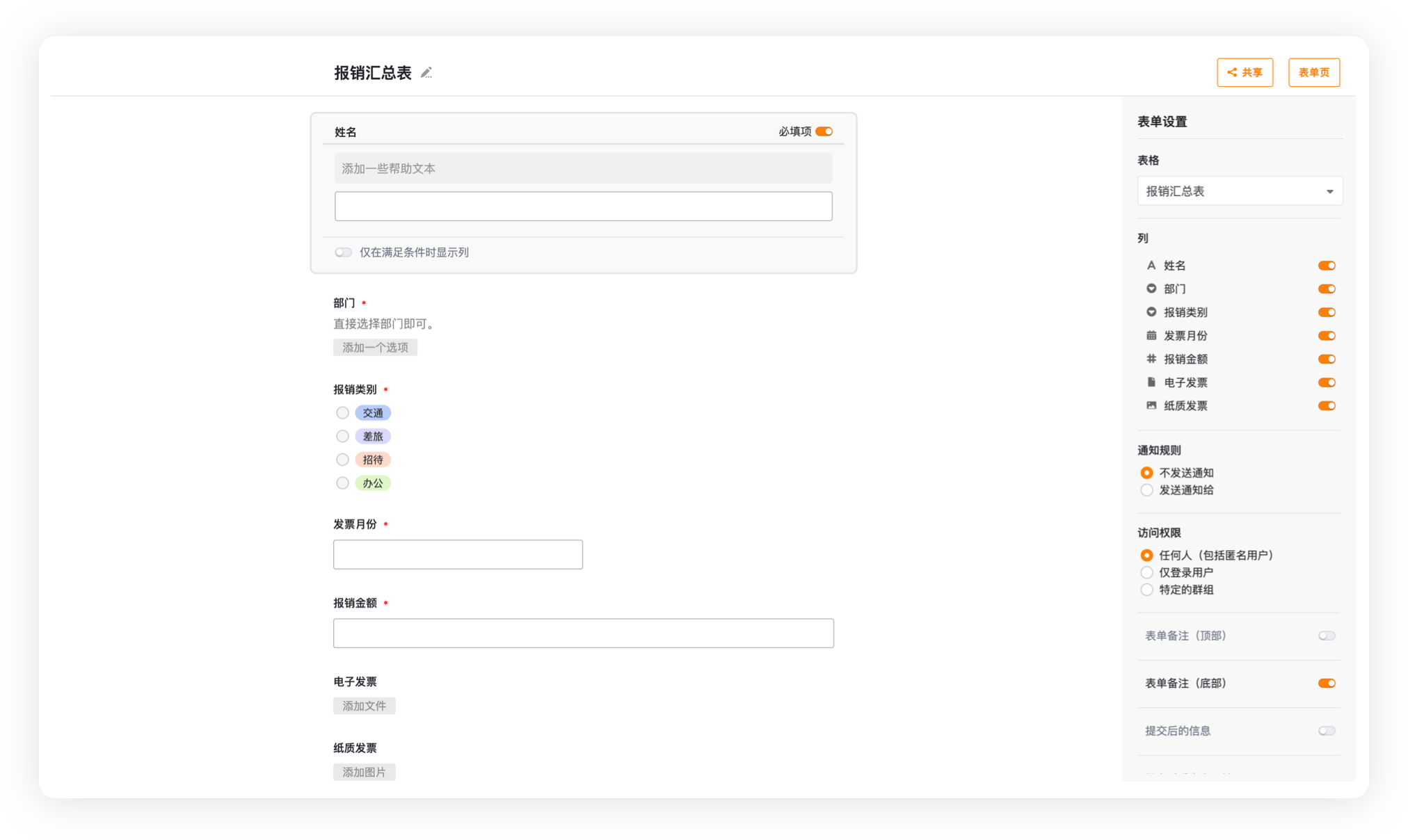 SeaTable 在表格上可以创建表单,把表单链接或二维码共享后,填写人在传统表单界面上填写并提交的数据,会实时自动汇总到表格里。提交一个表单,表格里就会增加一行。不需要再手动汇总。步骤如下: