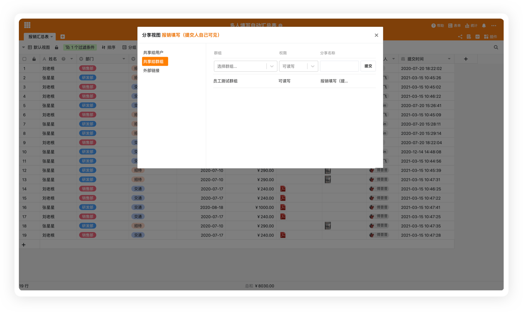 点击分享视图并选择共享给团队内部的哪些人、部门、群组。(所有人填写的数据会实时自动汇总到表格的默认视图里,也会实时进入到符合视图条件的各个视图里,也会进入到创建好的统计图表里)