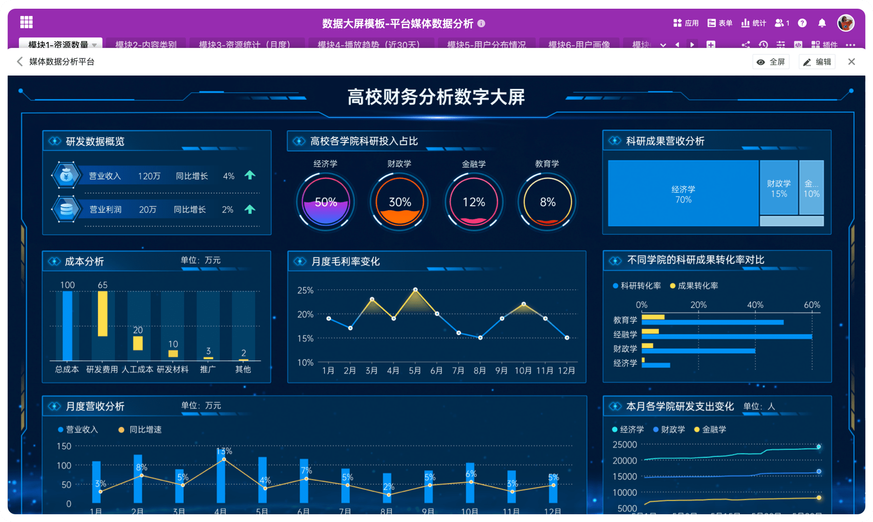 SeaTable 不仅能管理数据,还可以通过数据大屏,以直观生动的图表元素呈现可视化数据,从而使复杂和抽象的校园信息更易于理解和表达。学校的各学院、部门都可以轻松设计数据可视化大屏,简单的点选就可以实现专业定制数据大屏的效果。无需额外安装软件,使用浏览器即可灵活投放至多种屏幕终端。比如在校生数据分析、招生数据分析、教职工数据分析、科研数据分析、高校科研数字大脑、行政办事数字大屏、财务分析数字大屏、就业指导数字大屏,等等。