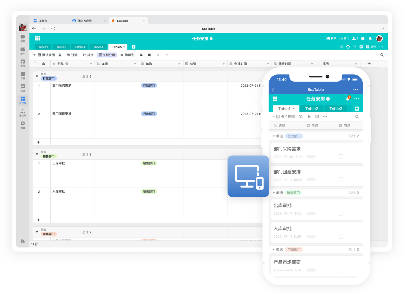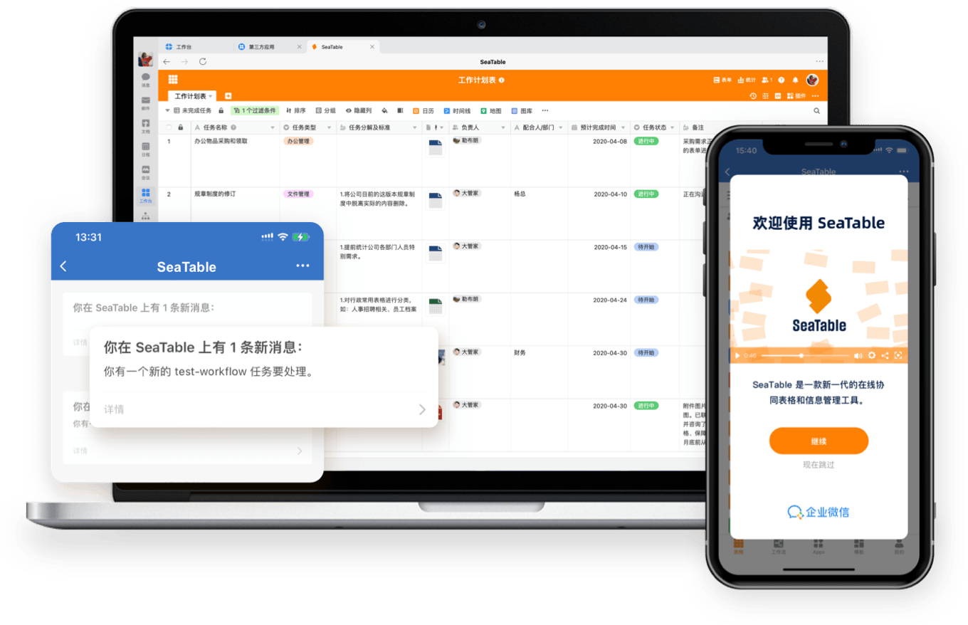 - 来自 SeaTable 的所有通知可以在企业微信版内直接接收查看,搭配企业微信快捷的即时交流,协作效率更快一步。