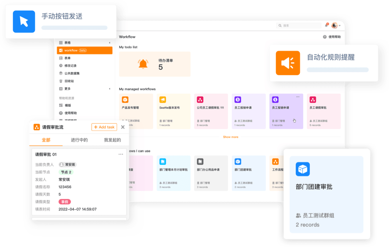 - 工作流变动通知:结合表格的自定义工作流功能,把工作流变动通知推送到企业微信群,加强查看自动流转的任务及状态变化。